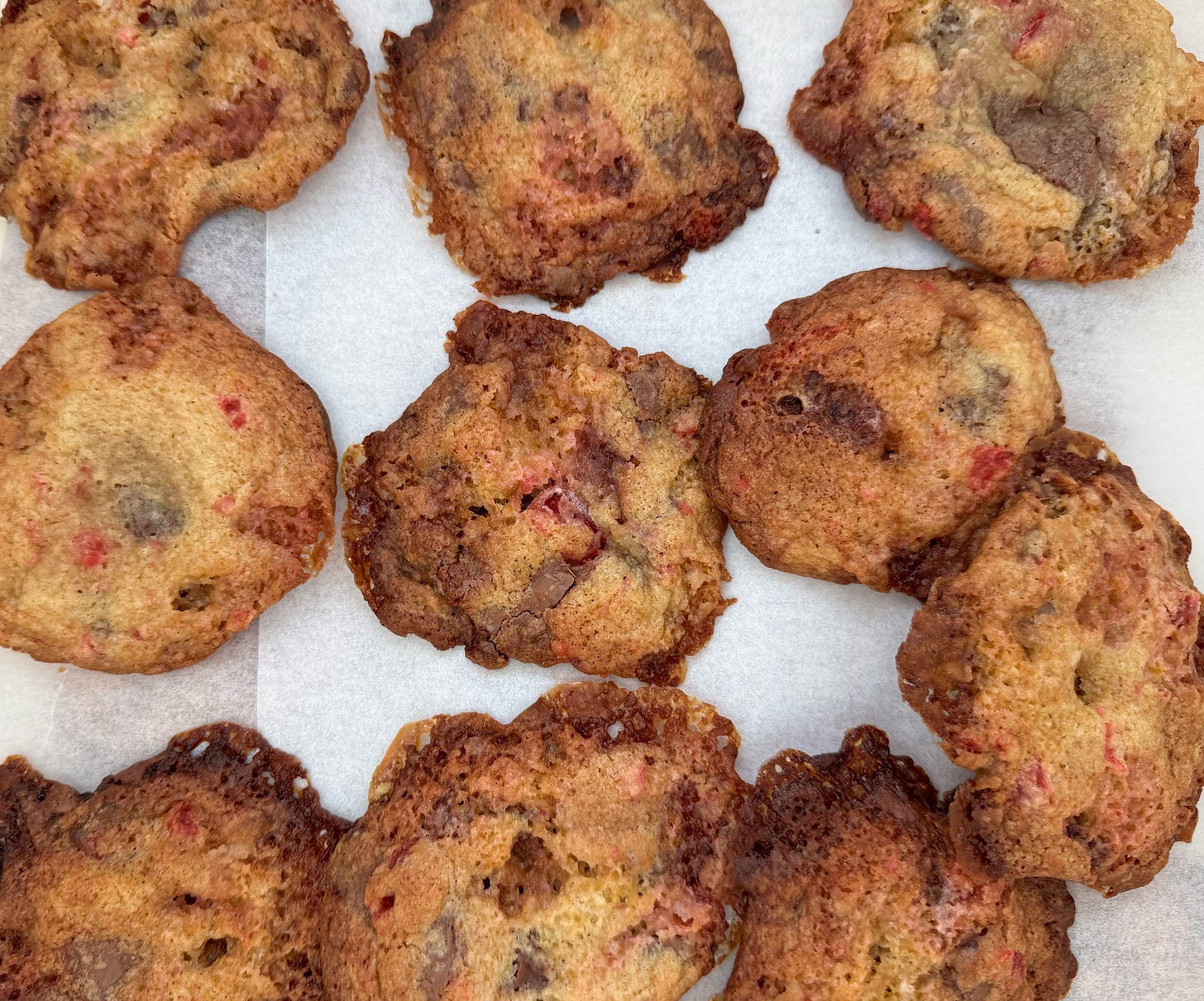 One of the bake sales at my daughter’s school was actually for parents, which gave me the chance to be a little more sophisticated. So there’s some spiced Hot Cross Bun Cookies (easy peasy) and Hot Cross Chelsea Buns (more of a challenge). On the last day of school, the cake sale was geared towards the smalls, so I took my classic cookie recipe and added dried fruit, chocolate chips and marshmallows for a rocky road-esque treat (these are definitely for those with a sweet tooth). Finally, chocolate cherry cupcakes with pink icing - because of course.