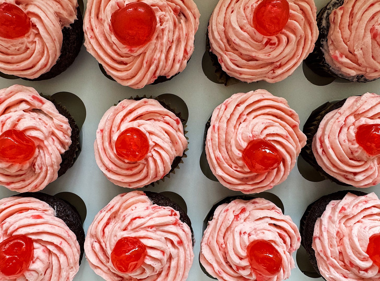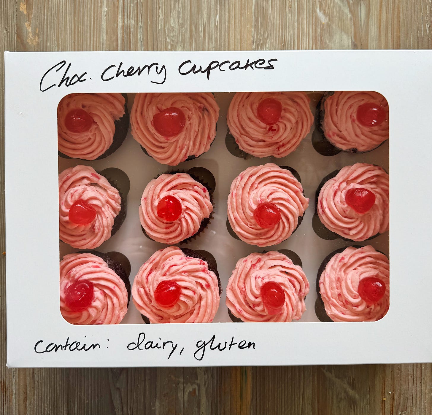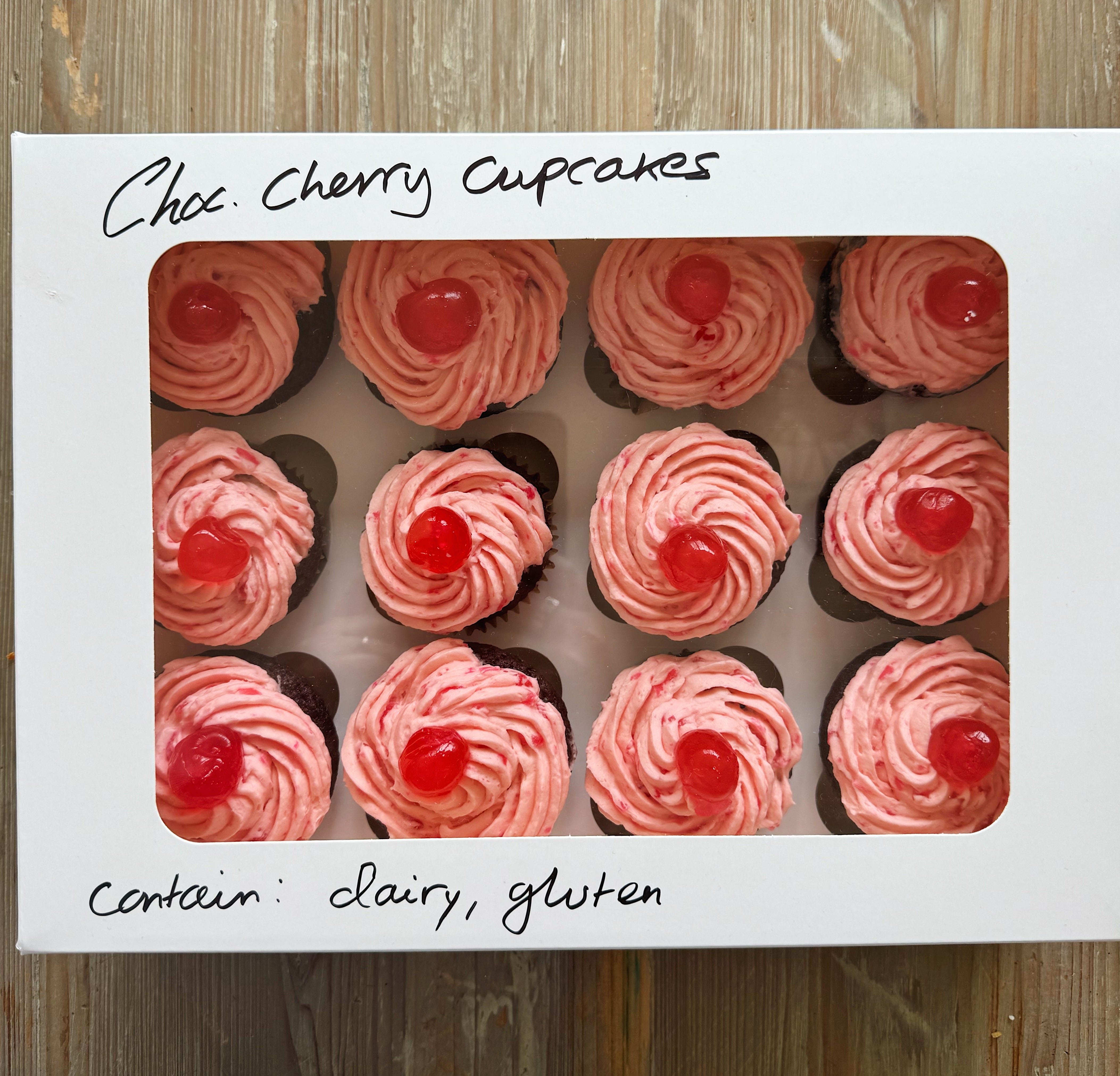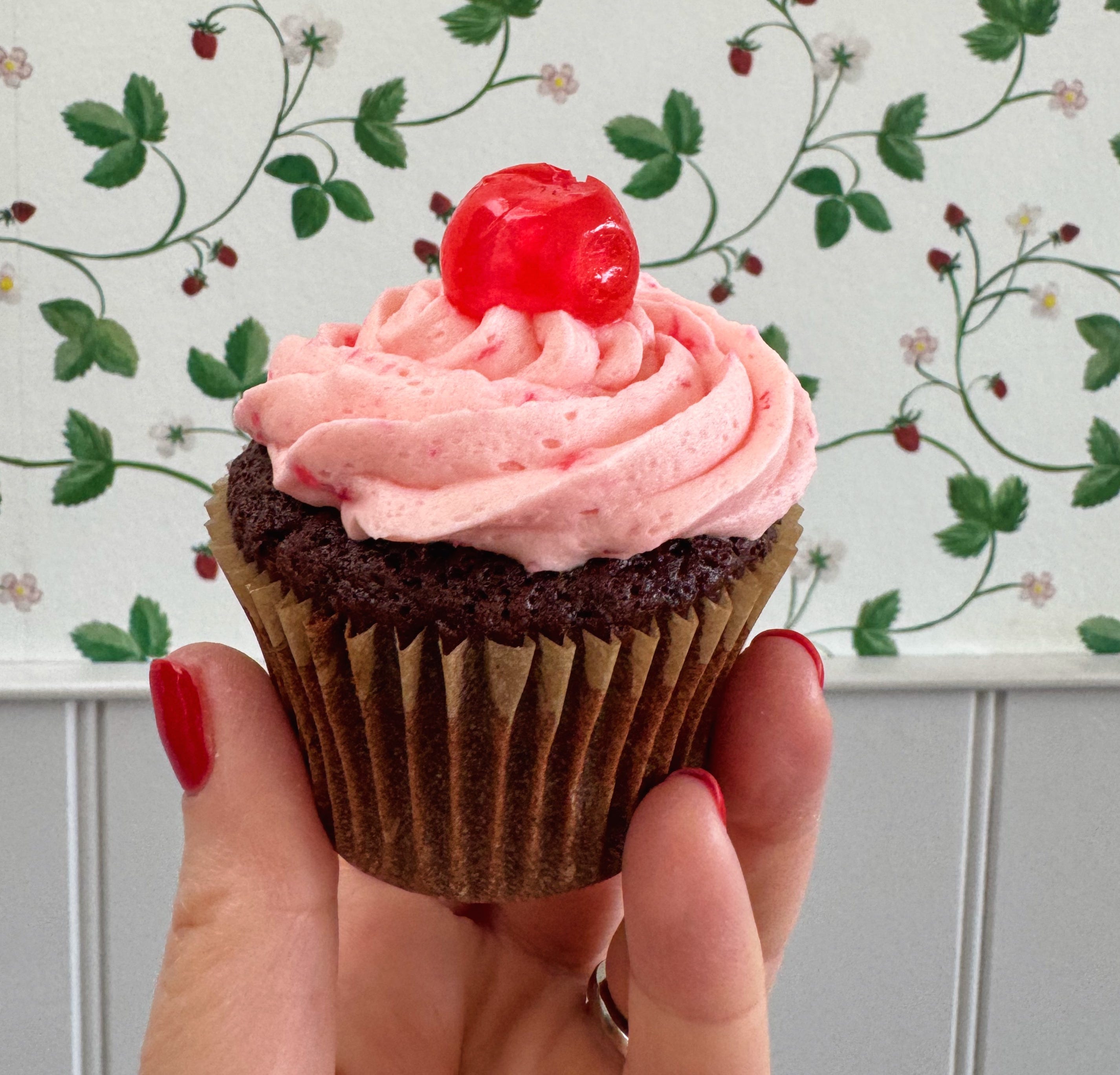 Chocolate Cherry Cupcakes Makes 12-14 You will need: For the cupcakes: 100g plain flour 50g cocoa powder 1 tsp baking powder 1/2 tsp bicarb 100g caster sugar 100g light brown sugar 3 medium eggs 100ml neutral oil (not coconut or groundnut) 2 tsp vanilla 150ml buttermilk or kefir 75g glacé cherries, chopped For the frosting: 200g unsalted butter, very soft 350g icing sugar 1 tsp vanilla extract 1-2 tbsp milk 100g glace cherries, finely chopped plus whole cherries to decorate 1-2 drops red food colouring sprinkles (optional) Method: 1. To make the cupcakes, preheat the oven to 200C/180C Fan/ 400F and line a 12-hole muffin or cupcake tin with liners. Whisk together the flour, cocoa powder, baking powder and bicarb in a small bowl. 2. Beat together the sugars, eggs and oil (either by hand or in a stand mixer). Add the vanilla and buttermilk, then tip in the dry ingredients. Mix well and fold through 75g glacé cherries. Divide the mixture between the cupcake liners and bake for approx 30 mins until risen and a cake tester comes out clean. Transfer to a baking rack and leave to cool. 3. To make the frosting, beat the butter and icing sugar together until soft and fluffy (I used a stand mixer but if your butter is soft enough you should be able to do this by hand). Add the vanilla and lighten a bit with milk to a pipe-able consistency. Add the glacé cherries and a drop or two of food colouring, beating well to get a bright pink consistency. 4. Pipe the frosting over the cupcakes or use a palette knife to spread over if piping is too much effort. Decorate each cupcake with an additional glacé cherry (or sprinkles if you prefer). Best eaten on the same day as baking.