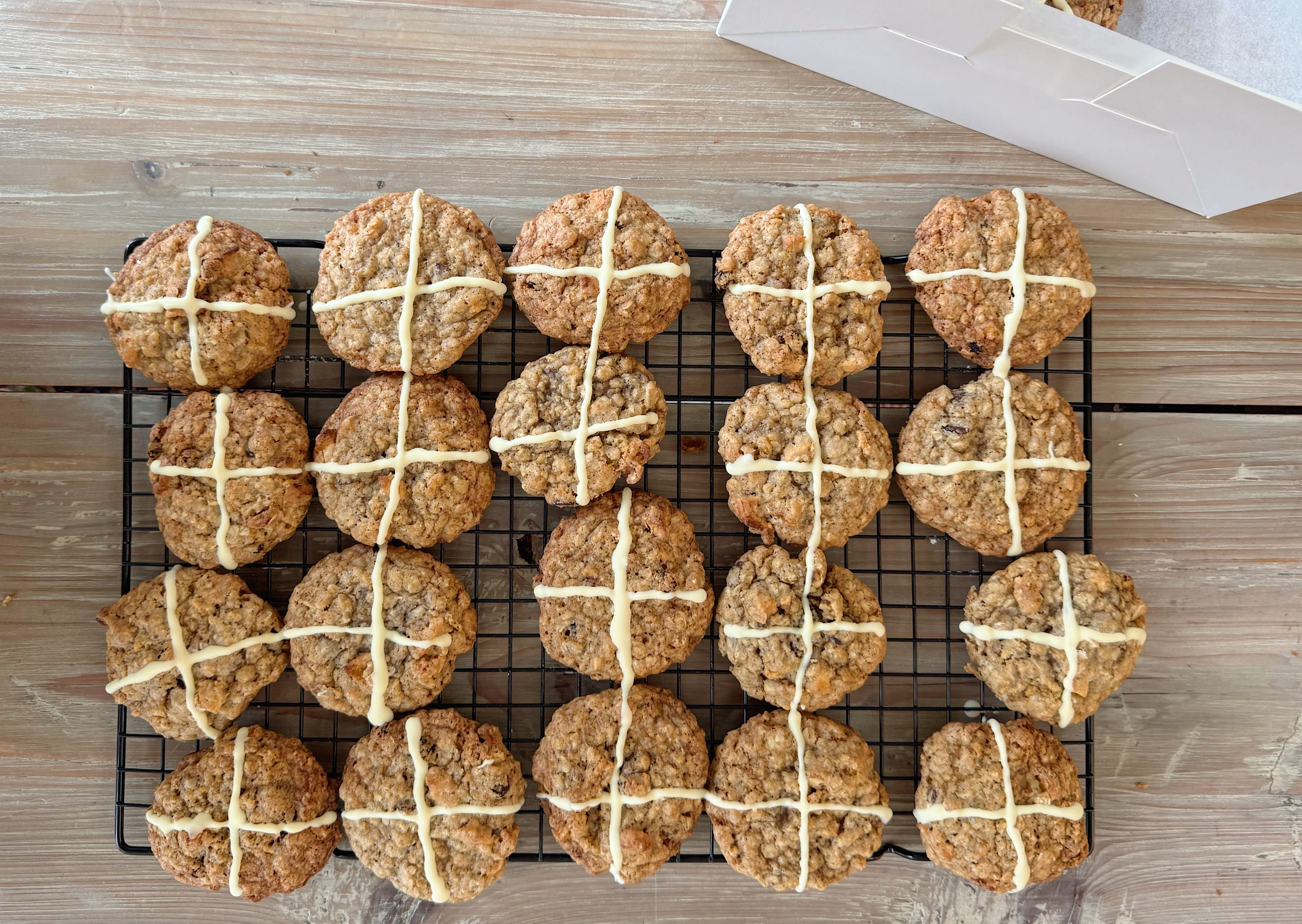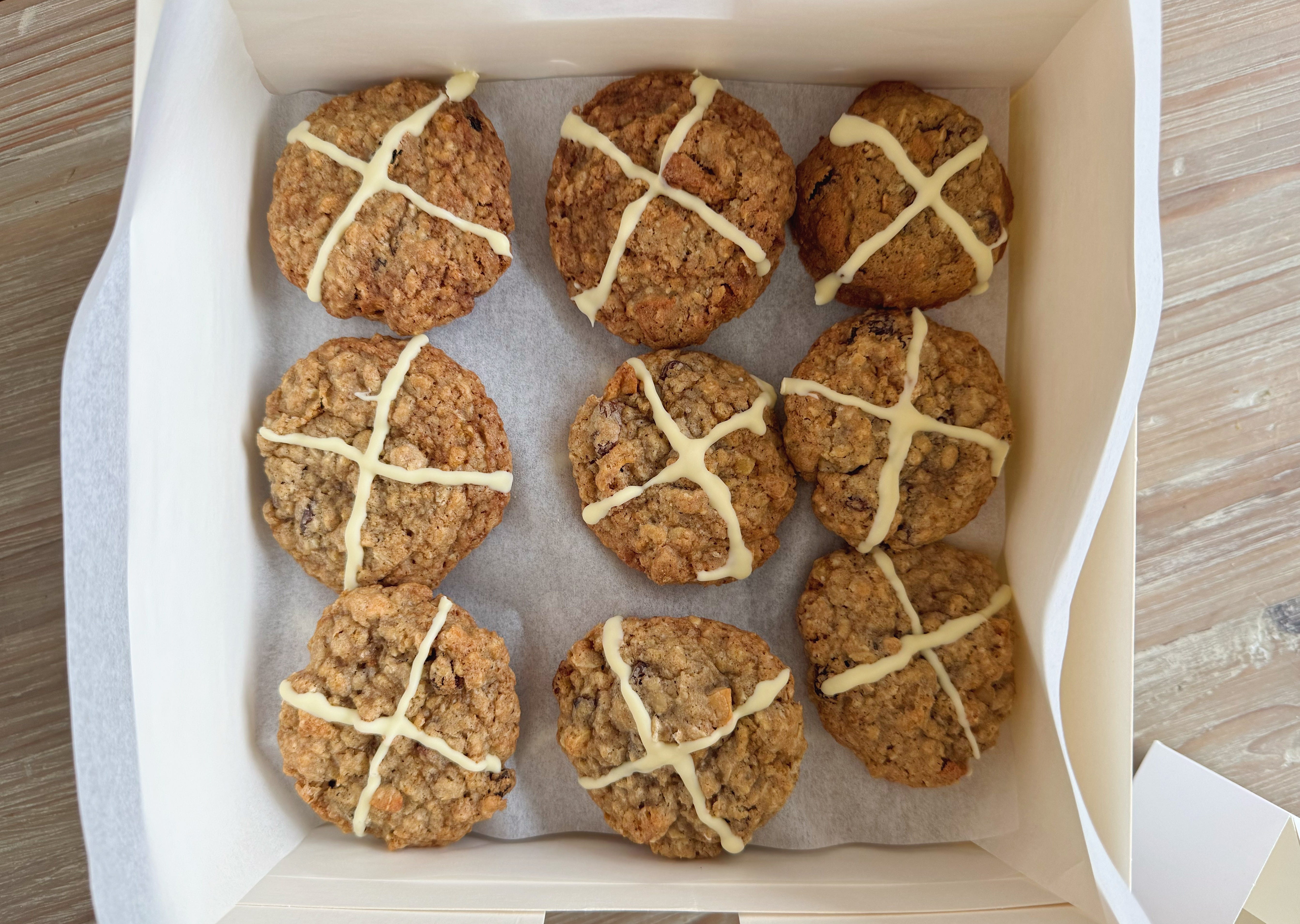 Hot Cross Bun Cookies Makes 12-14 (can be doubled) You will need: 100g plain flour 100g jumbo oats 1/2 tsp bicarb 2 tsp mixed spice 1 tsp ground cinnamon 115g butter, very soft 75g caster sugar 75g light brown sugar 1 large egg 1/2 tsp vanilla extract 25g dried apple (the soft kind), roughly chopped 25g mixed peel 50g sultanas To decorate: 50g white chocolate, melted Method: 1. Heat your oven to 190C/ 170C Fan/375F and line two baking sheets with parchment. Whisk together flour, oats, bicarb and spices in a bowl along with a generous pinch of salt and set aside. 2. Beat butter and sugars together in a large bowl until light and fluffy - either by hand or in a stand mixer. Add the egg and vanilla, beating well (not to worry if the mixture splits a little), then tip in the dry ingredients. 3. Fold through the cherries, chocolate and marshmallows until well incorporated. Refrigerate the bowl for about 15-20 mins for the dough to firm up a little. 4. Scoop walnut-sized balls of dough (approx 2 tbsp worth) and place on the baking sheets with plenty of room in between to allow for spreading. Bake for 8-9 mins then transfer to a wire rack to cool completely. 5. Melt the white chocolate in the microwave - do this slowly, in 20 sec bursts, stirring frequently. Use to pipe or spoon white chocolate crosses on the cookies and leave to harden fully.