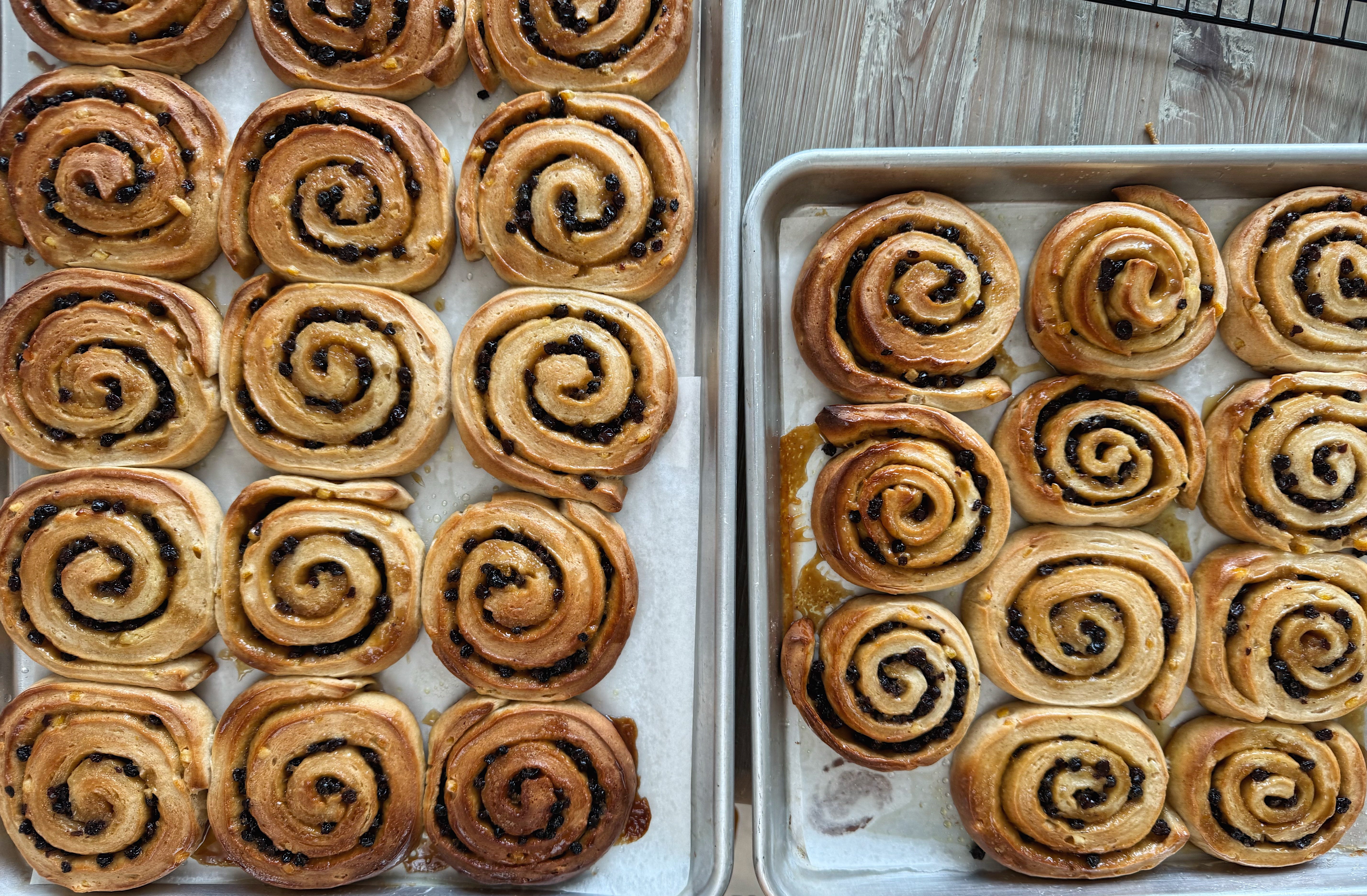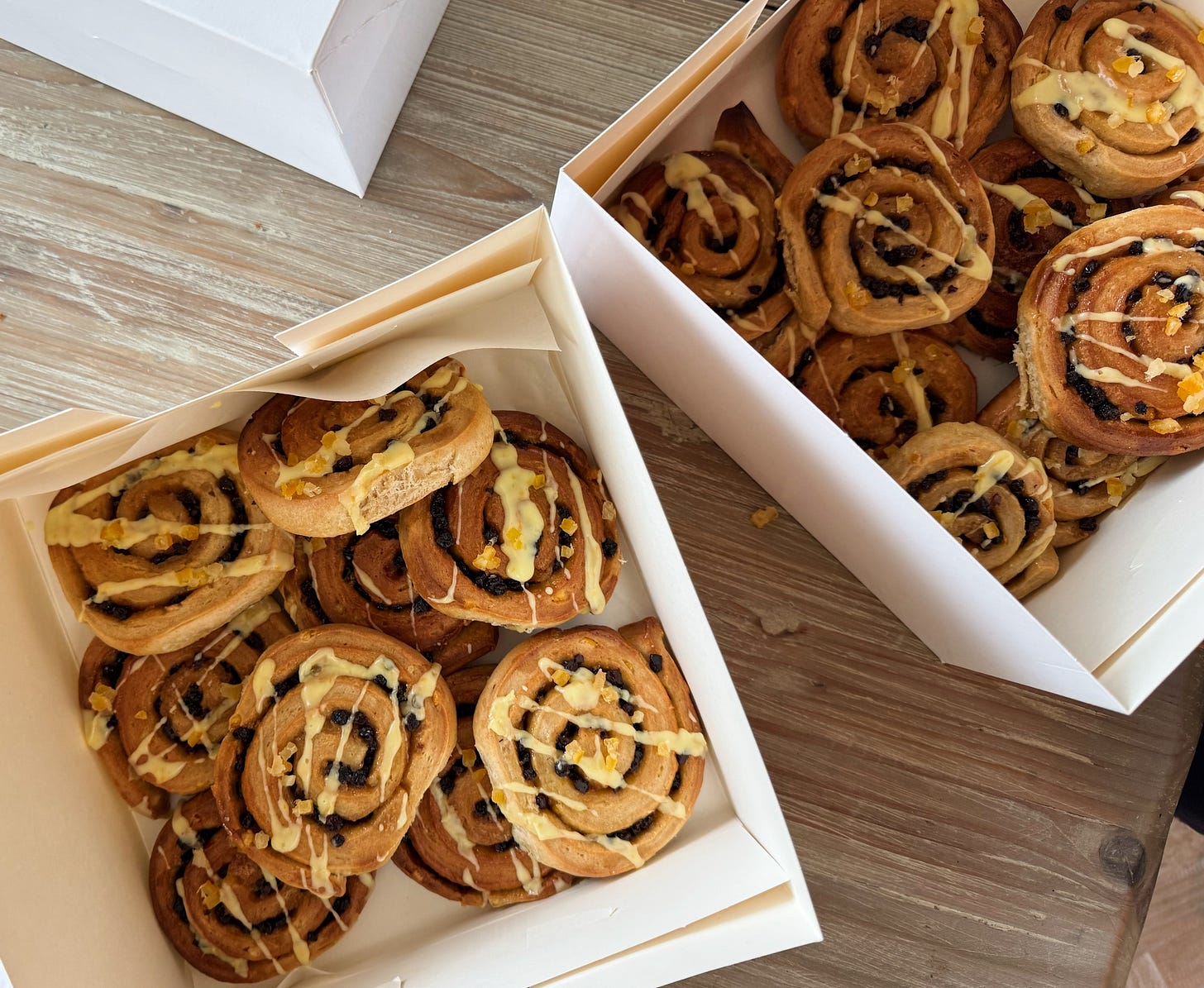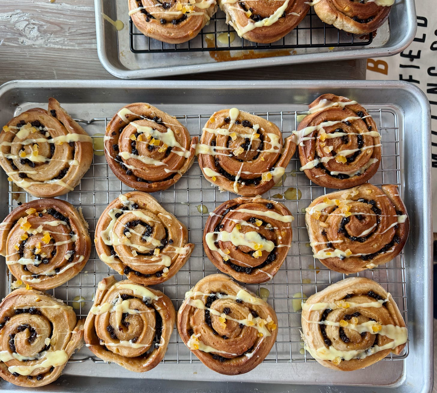 Hot Cross Chelsea Buns Makes approx 30 You will need: For the dough 1.1kg plain flour 200g caster sugar 200g butter, softened 500ml semi-skimmed milk 70g fresh yeast or 25g instant dried yeast 15g salt (table salt is fine) 2 tsp mixed spice 100g mixed peel 2 lemons, zest only For the filling: 250g soft butter 150g light brown sugar 2 oranges, zest only 200g currants For the glaze/topping: 1 orange, zest and juice 1 lemon, zest and juice 150g icing sugar 50g mixed peel Method: 1. Begin by mixing together the dough. I strongly recommend doing this in a stand mixer - start with the dry ingredients and leave to run for a minute, then add everything else. Use your lowest setting and allow the machine to run for at least 20 mins, but even up to 40 mins or an hour (!) until you get a very stretchy dough. It really takes this long for the gluten to develop properly. Test by grabbing a small ball of dough and stretching it out - if it stretches thinly enough for you to see through it (the so-called ‘window pane test’) then it’s ready. I tie an ice pack to my stand mixer to make sure it doesn’t overheat and give it a few breaks too, as mine is a tired old dame. 2. Flatten the dough out to a large, rough rectangle with your hands. Transfer to a baking sheet, cover with cling and leave in the fridge for 30 mins to rest. 3. Meanwhile, make your filling by beating together the butter, sugar and orange zest until light and spreadable. 4. On a lightly floured work surface, roll out the dough to a rectangle about 2mm thick, approx 90 x 60 cm, with the long side facing you - I like to trim the edges to keep things neat. Spread the orange and sugar butter all over the dough, right to the edges, then scatter over the currants, pressing them in lightly with your hands. 5. Roll the dough up - start from the middle of the long side closest to you, keeping the roll tight. Leading from the middle helps to keep the roll even-shaped, do a little at a time, following with the ends. Repeat until you have a long sausage and use your hands to arrange and shape the dough as evenly as possible. 6. Make indents at approx 2cm intervals along the rolled up dough, then cut with a sharp knife - this gave me 32 buns. At this stage, you can freeze your buns if baking later or leave them to prove and bake immediately. If freezing, you can pack the buns pretty close together on a baking sheet and place in the freezer loosely covered with cling. They will keep there for several days. 7. If baking on the same day, the buns need to prove. Place on baking sheets with about an inch or so in between each and cover with a tea towel. Leave for anywhere from 45 min to several hours - in the summer it will be less time and in the winter much more. If using frozen buns, take them out the night before you will be baking them (in the summer, do this right before bed, in the winter around dinnertime). You are looking for a change in size (I always think the term ‘doubling’ is misleading - they should have grown but may not double) and a puffiness. If this is taking a long time (particularly if you have a cold kitchen or it’s the coldest March in living memory), you can create a makeshift proofing oven by placing a baking dish of hot water in the bottom of the oven and placing your sheets in there for a bit (oven off). 8. Preheat the oven (without any buns in them!) to 220C/200C Fan/425F then bake the buns for about 10 mins or so (check halfway, if your oven is patchy you might need to rotate the baking sheets), until golden and well-baked (ie no patches of wet dough). Remove from the oven and leave to cool fully, transferring to a wire rack when they are cool enough to handle. 9. While the buns are cooling, make the glaze. Combine the zest of 1 orange and the juice of half with about 150g icing sugar. Adjust the amount of icing sugar and orange juice to create a drizzleable consistency. Drizzle over the buns and sprinkle with mixed peel.